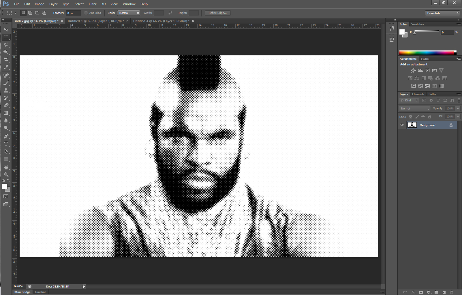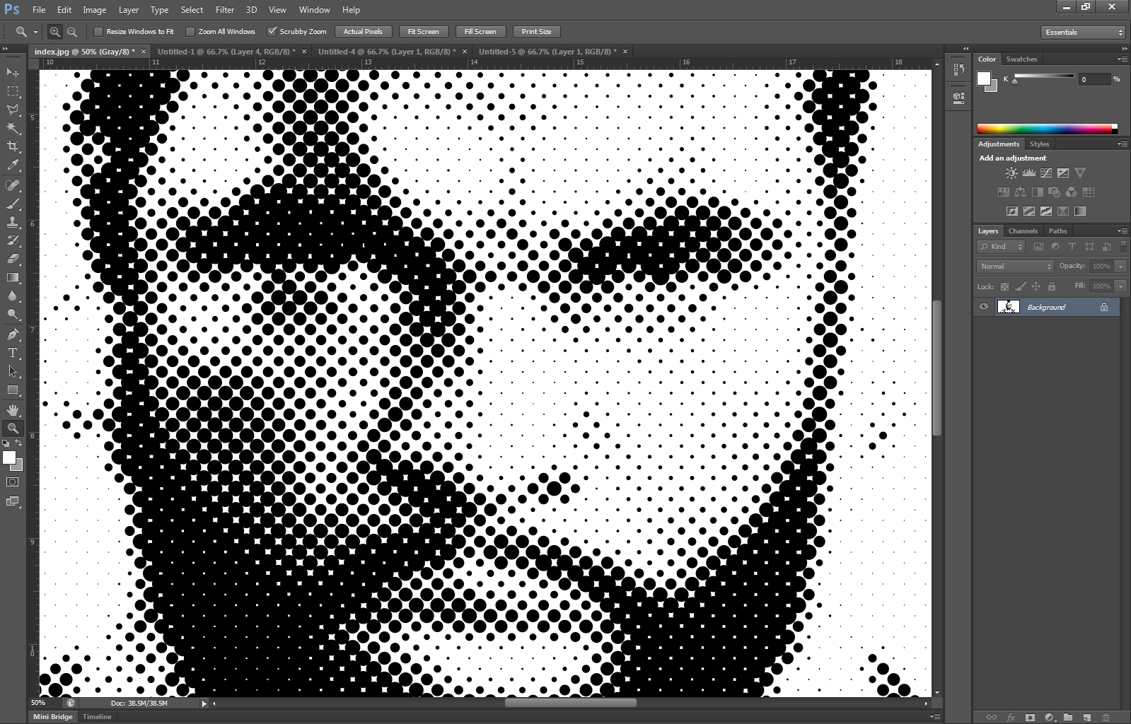 Step 5: Apply Halftone Filter: Filter –> Pixelate –> Color Halftone. Set Max Radius to 30 (Pixels), Channels 1-4 all to 45 degrees.