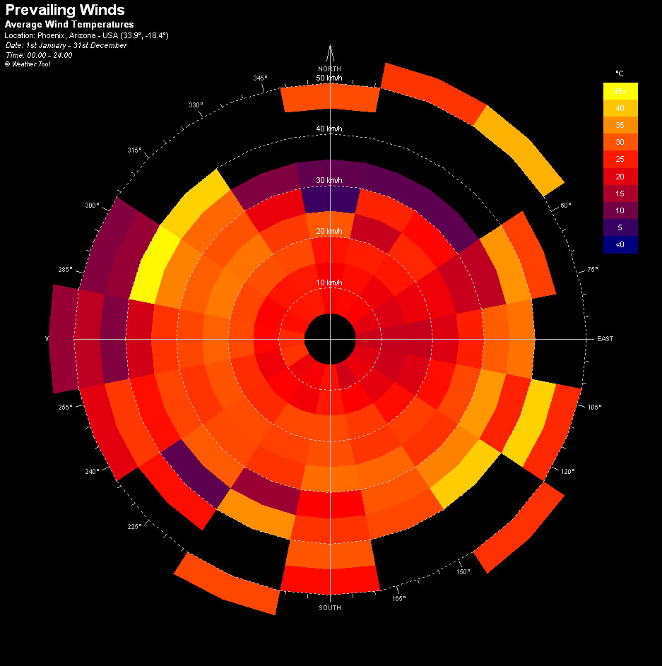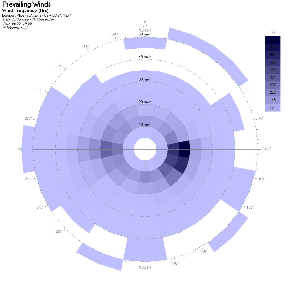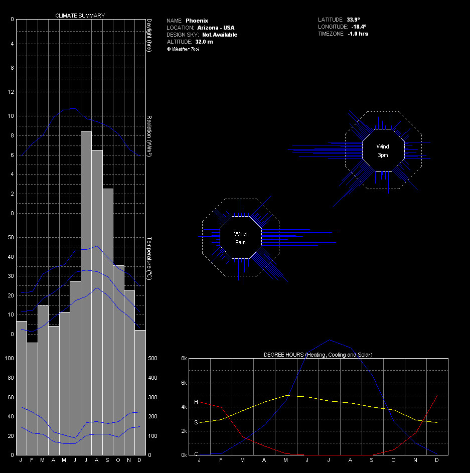 Here are some more useful diagrams pertaining to the wider Phoenix Metro area weather patterns. The data was recorded in 2003 most likely from Sky Harbor Airport. The weather file can be downloaded for free from http://www.ecotect.com/downloads/weatherdata although you will need an Ecotect license to run the analysis. The school labs have them. Enjoy.