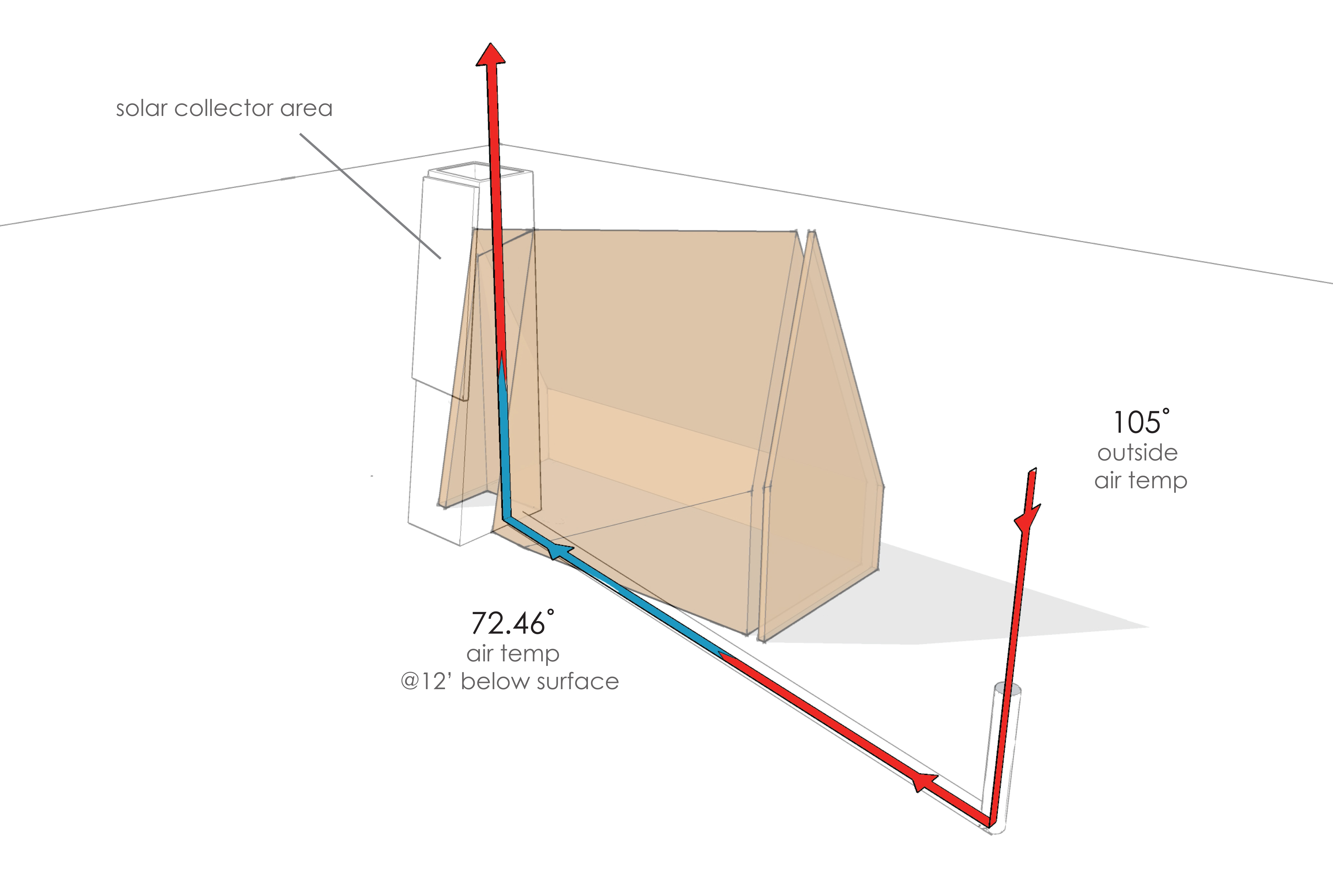 Keeping with the reinterpretations of iconic forms, I am curious as to whether the chimney form can be repurposed as a passive cooling system. Two systems I am exploring: the ‘passive down-draft cooltower’ and the ‘solar chimney’ are presented below as passive cooling options to circulate air within each home without the use of fossil fuel driven HVAC systems.