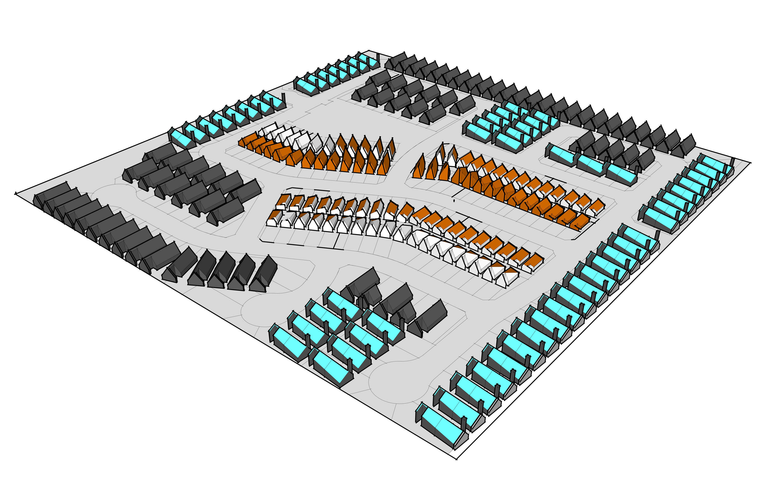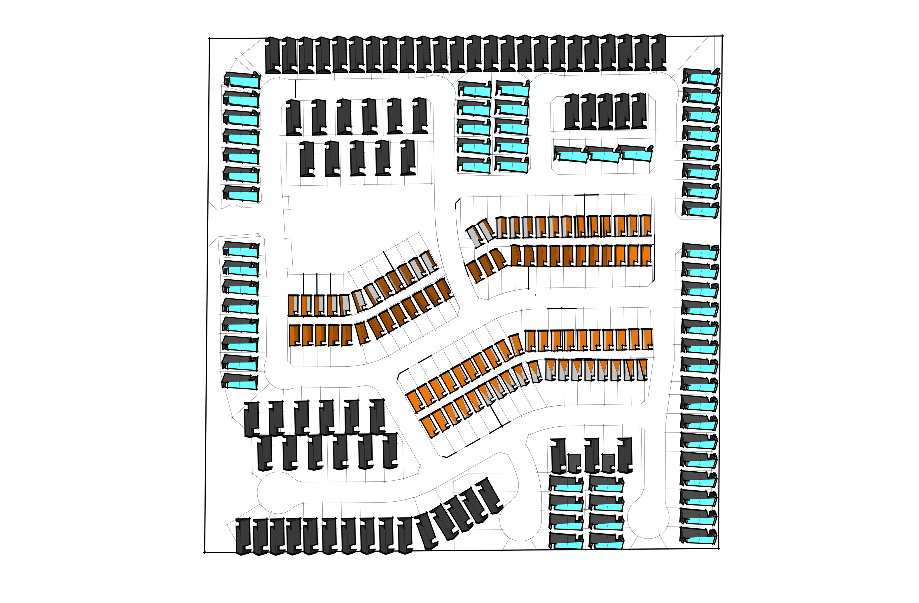 The prior site plan, although listed as ‘preliminary’, confused reviewers in its simplicity and rudimentery arrangement. What I had attempted to do before was calculate potential kW harnessed from PV panels. Below is a revised site plan more closely resembling the final product. I am preserving the sun dial homes as I feel they represent the crux the project. While the surrounding homes harness power and house their occupants in the present and near future, the sundial homes are intended to function into the distant future. I have developed several models of home, both single- and dual-family. They are arranged intentionally as to preserve the extant infrastructural grid. Density is exactly doubled. 180 homes shifts to 360. This number represents the solar calendar year of Native Americans in both Northern and Southern Hemispheres.