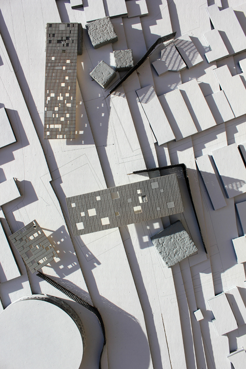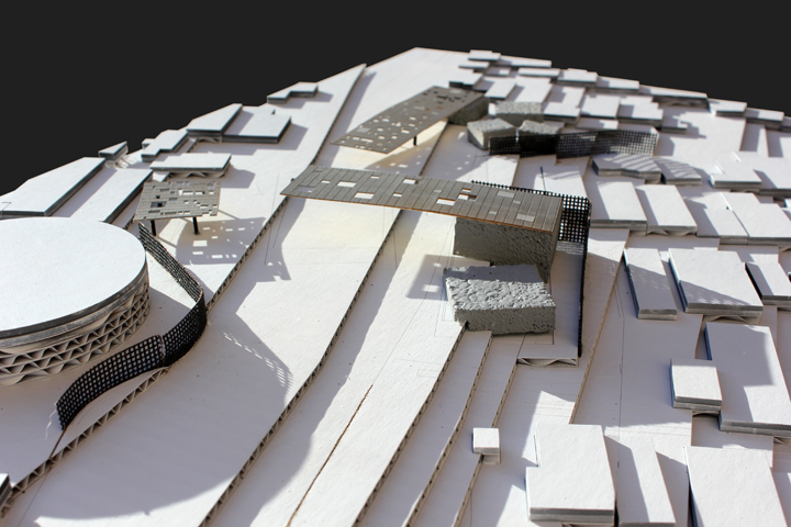 3D Site Model in process for Nodulo 003. A Skills Learning Center adjacent to stairs, Markets for both fixed and mobile transactions, a fog harvesting pavillion repeats vocabulary of water towers. Combinations of 3: market, plaza, cancha de futbol; escaleras, colegio, pavillon; 3 terrazas. San Juan de Miraflores, Lima, Peru