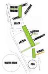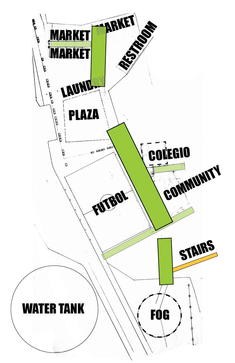 3 Infrastructures -ESCALERAS; CANCHA DE FUTBOL; TANQUE DE AGUA- are complemented by 3 Programs -LEARNING CENTER; MARKET; PLAZA.